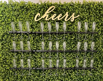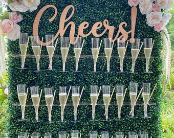 . Call us at 855 759-0249 for faster questions and flower wall rental reservation bookings. Items can be placed on top of the pedestals to assist with placing your decor at your event. This Champagne Wall is 7ftx4ft and holds 75 champagne flutes glass or plastic.